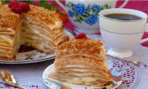 Приготовьте на масленицу вкуснейший блинный тортик с заварным кремом. Для этого торта предварительно нужно испечь блинчики по вашему любимому рецепту. Лучше, если это будут толстые блинчики. Блины на ряженке идеально подходят для такого торта. Заварной крем приготовьте классический, но сделайте его немного гуще чем обычно. По желанию торт можно прослоить фруктами, добавить шоколад — всё зависит от вашей фантазии и желания. Состав для блинчиков: Ряженка — 500 мл Мука пшеничная — 150 гр Сахарная пудра — 3 ст. л. Соль — щепотка Яйца — 2 шт. Сода — 0.5 ч. л. Масло подсолнечное — 3 ст. л.