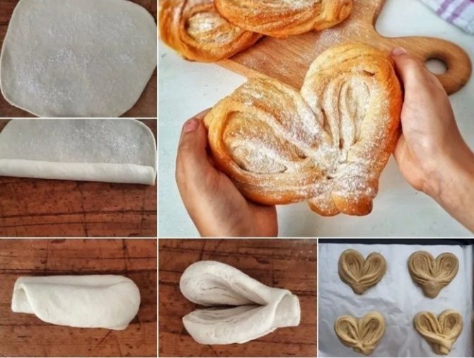 Как я уже сказала в самом начале, что в статье будут еще рассмотрены способы заворачивания булочек, так вот ловите следующий вариант в виде сердечек. Такие плюшки получатся очень нежными на вкус, а за счет корицы с пикантным ароматом.