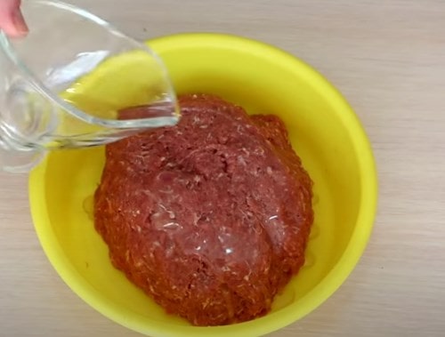 Вбейте в фарш яйцо, добавьте раздавленный прессом чеснок. Подсолите, заправьте перцем. Залейте хорошо охлажденную минеральную воду.