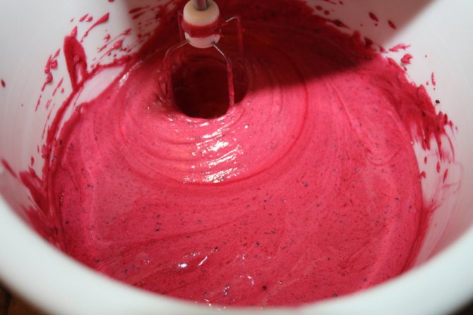 2. Ягоды протираются после этого с сахаром и взбиваются. В середине процесса нужно добавить яичный белок и взбивать на полной мощности.