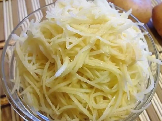 Чистим и трём на крупной тёрке картофель. Чтобы он не потемнел, его можно сбрызнуть лимонным соком. Раскладываем по нашим гнёздам. Сверху немного солим.