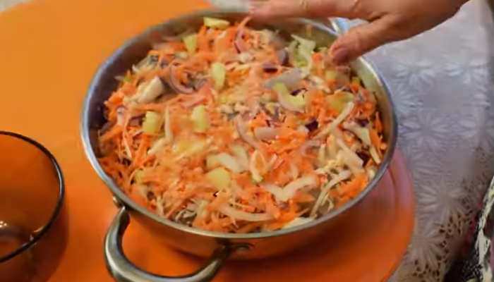 - Очищенные и помытые лук и морковь подготавливают для маринада – лук режут крупными кусочками, а морковь – натирают при помощи крупной терки;