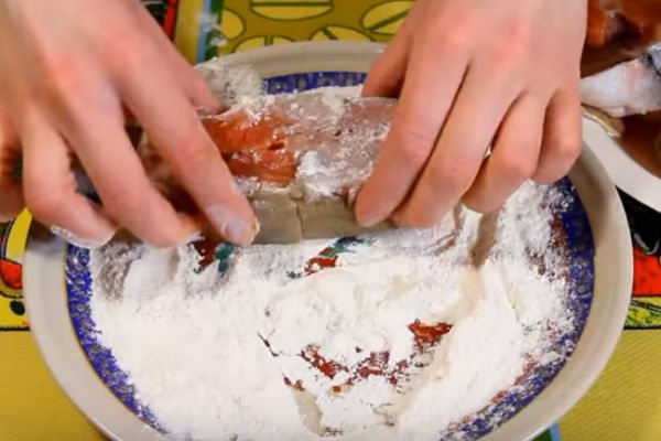Рыбные кусочки посолить, поперчить с обеих сторон, обвалять в муке