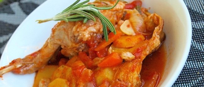 Мясо тушеное с картошкой и овощами весьма самодостаточное блюдо, не требующее дополнительного приготовления гарнира. Особенно вкусно подать к трапезе соленья или нарезку из свежих овощей. В подобном исполнении можно оформить любой мясной продукт, в данном случае представлен вариант с кроликом.