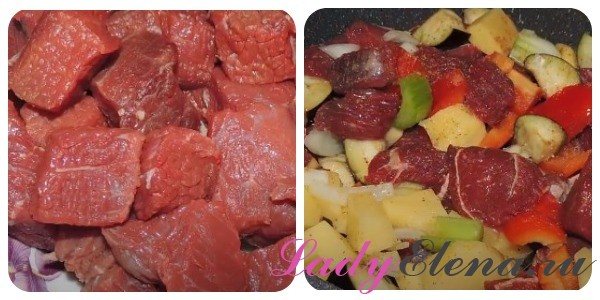- Овощи к мясу добавляют постепенно. Сначала кладут лук и морковь, а затем уже более сочные овощи: помидоры, баклажаны, кабачки. Желательно лук и морковку обжаривать отдельно, а потом соединять с наполовину приготовленной говядиной. Тогда овощи сохранят форму и не получатся переваренными. Особенно это актуально, когда говядина старая и требует длительной тепловой обработки.