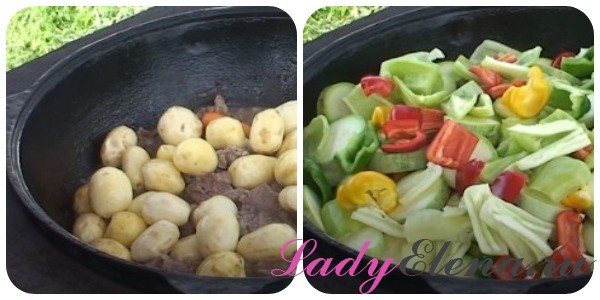 - Нарезают все компоненты и укладывают слоями в казан, приправляя каждый по вкусу.