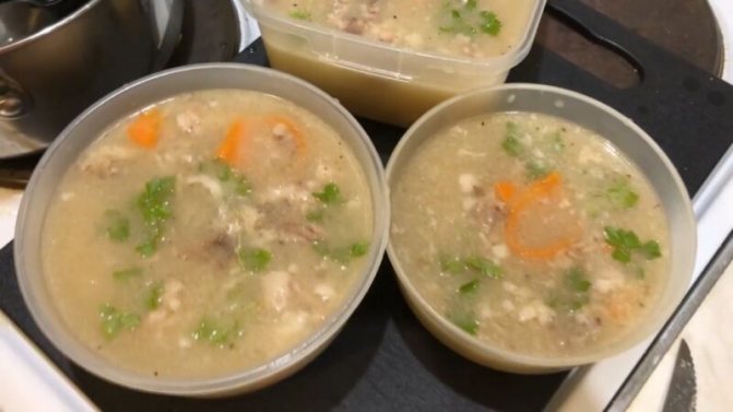 7. Свинину распределите по разным ёмкостям и залейте тёплым бульоном.