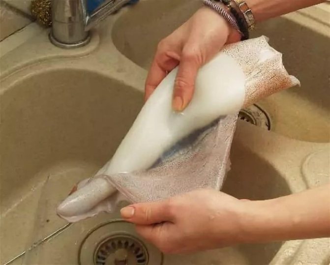 - Не нужно дожидаться, пока тушки разморозятся полностью. Если они будут еще плотными, их будет проще почистить. Чистка проводится по направлению от щупалец к голове особи. Для этого достаточно подцепить кожу и потянуть. После этого удаляются пленки, хитиновые пластинки, внутренности.