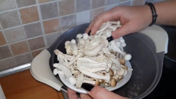 3. Грибы откиньте на дуршлаг. Промойте их под проточной водой и отставьте в сторону, чтобы лишняя жидкость стекала.