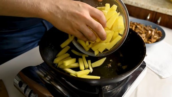 13. В эту же емкость, в которой мы тушили, доливаем растительного масла и выкладываем наш порезанный картофель.