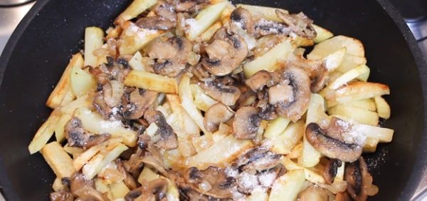 Создается такая картошка очень просто. Она томится на сковородке на хорошо прогретом растительном масле. Затем смешивается с заранее пожаренными грибами.