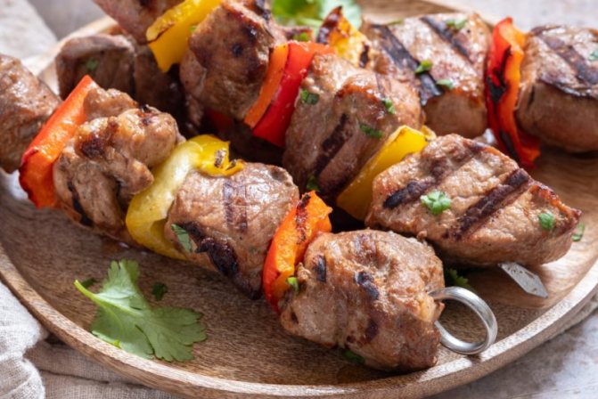 - Нанизать кусочки свинины на шампуры и обжарить за 20-25 минут на мангале, не забывая почаще переворачивать.