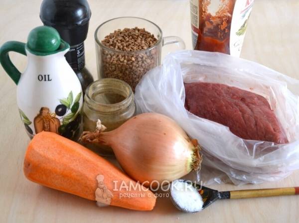 Подготовьте необходимые ингредиенты для тушеной гречки с говядиной: мякоть говядины (или телятины), гречневую крупу, лук, морковь, томатный соус, рафинированное масло для жарки, соль, перец и любимые специи по вкусу. Я в качестве приправы взяла смесь «хмели-сунели» — очень ее люблю!