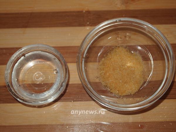 Сначала подготовим желатин. Для этого зальем его водой и оставим для набухания. После того как желатин впитает всю воду прогреем его.