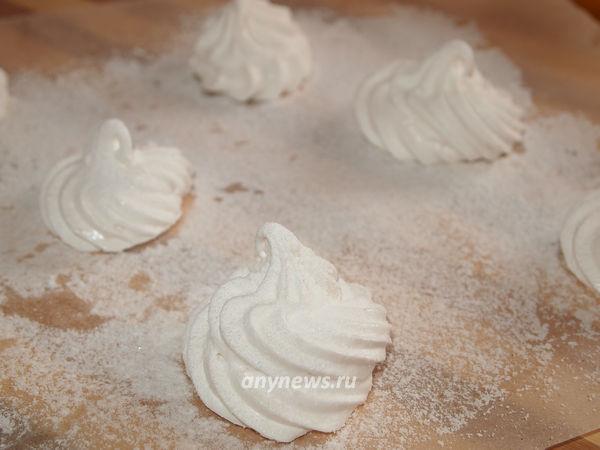 Для формирования зефира используем кондитерский мешок или шприц. Выкладываем в него загустевшую сахарную массу и отсаживаем зефир на пергаментную бумагу, посыпанную сахарной пудрой.