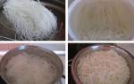 рисовая вермишель | 5 | как вы уже знаете, это не обычные макароны, поэтому их не варят, а выдерживают в теплой или горячей воде примерно 10 минут, хотя отдельные рецепты все-таки предполагают 5-минутную варку на среднем огне после закипания воды; количество на одну порцию очень легко рассчитать, поскольку производитель связывает отдельные тонкие макаронины в пучок |