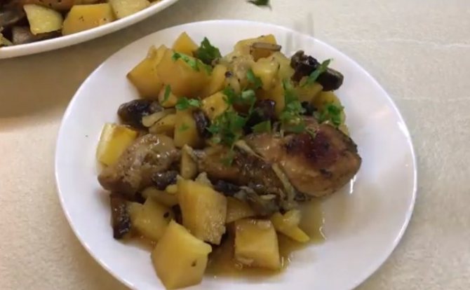 А кто любит грибочки — этот рецепт для Вас! Грибы можно использовать в этом блюде не только шампиньоны, но и любые другие, которые вам больше всего по вкусу. Румяные куриные ножки, шампиньоны и картошечка в пикантной подливке ммм, что может быть вкуснее?! Не будем тратить время и займемся приготовлением…