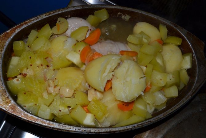 - Берем курицу и все овощи, которые есть в доме. Сверяться со списком ингредиентов в этом рецепте совершенно не следует. К кабачку и картошке можно добавлять что угодно, например, перец болгарский, капусту шинкованную и т.д. Следует только смотреть, чтобы не было продуктов с откровенно долгим сроком приготовления, типа гороха.