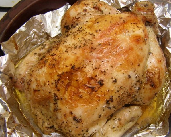 Заверните курочку в фольгу, лучше в два слоя, чтобы сок при запекании не вытек. Положите птицу на противень в предварительно разогретую духовку в 200 градусов и оставьте на 2 часа. Чтобы проверить готовность блюда, развернув фольгу, проткните птицу ножом. Если выделяемый сок — прозрачный, значит, курочка готова. Мясо покроется румяной корочкой, если вы оставите верх курицы открытым еще на пол часа.