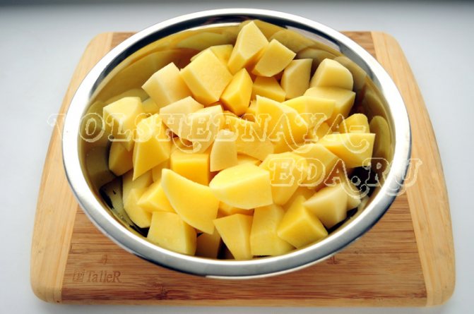 Картофель очистить, промыть и нарезать небольшими кубиками как на фото.
