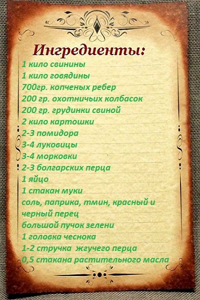 Такой гуляш по-венгерски называется бограч, что переводится как котёл, или котелок. И готовят его на улице, на костре. Повар, обычно мужчина, варит жирный бульон из нескольких видов мяса. Свинина, говядина, шпик и колбаса, а так же грудинка, рёбрышки или корейка. Все эти продукты подходят для изготовления бограча.