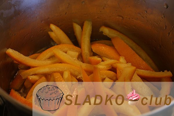 - Приготовить сахарный сироп, вскипятить его и добавить апельсиновую кожуру.