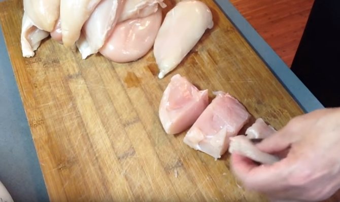 1. Порубите острым ножом куриное филе на кубики. Сильно не мельчите, это ни к чему.