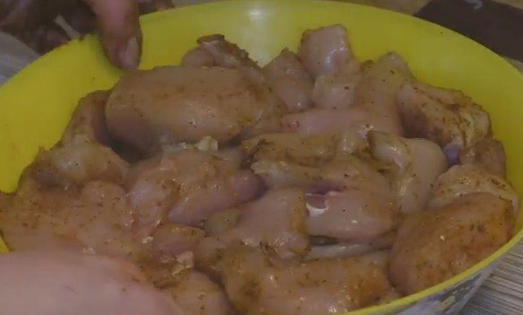 Вот специи можно брать абсолютно любые, какие нравятся. Я пробовала с итальянскими травами, пробовала с мускатным орехом, всегда получался разный вкус мяса. Сегодня делаю куриный шашлык с куркумой и базиликом.