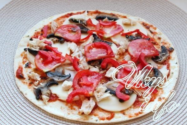При быстром приготовлении тортилья остается мягкой и по вкусу напоминает пиццу на очень тонком тесте. Начинка для такой пиццы может быть абсолютно любая – курица, колбаса, сосиски, грибы или овощи. Единственное условие – начинка должна быть полностью готова, поскольку на самой тортилье она приготовиться не успеет.