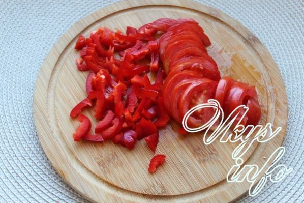 Раскладываем свежие овощи: кружки помидора и соломку сладкого перца.