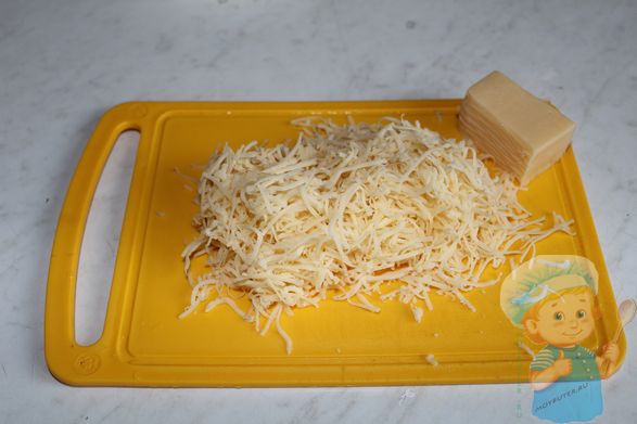 Разбрасываем ломтики твердого сыра плавких сортов: хотите — натрите, не имеет значения.