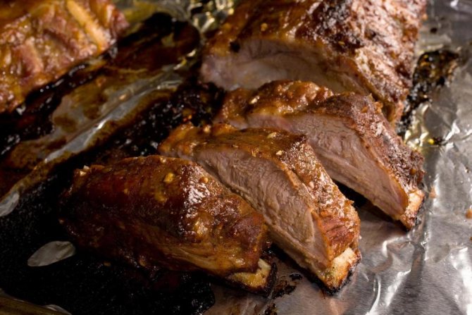 Важно! Духовая свинина отличается от остальных блюд тем, что она готовится в духовке из одного цельного куска с ребрами и хребтом или из сплошной мякоти без жира.