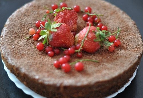- Испечённый пирог нужно немного остудить, вытащить из формы, украсить ягодами клубники, разрезать на порционные куски и подать на стол.