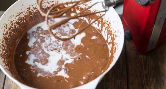 - Предварительно просеять муку и какао-порошок, влить в состав 250 мл молока, перемешать до устранения комков.
