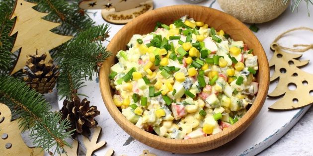 Классический рецепт салата из крабовых палочек с кукурузой и яйцом