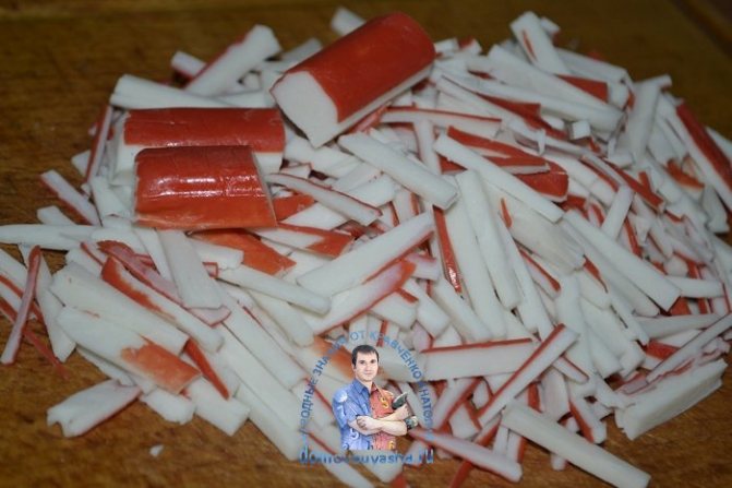 - Возьмите крабовые палочки и порежьте их на равномерные кусочки.