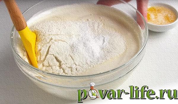 - Соединить сухую смесь из муки и разрыхлителя со сметаной, в которой предварительно нужно разбавить соду.