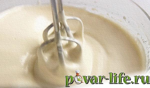 - Взбить холодные сливки. Вмешать взбитую массу из сгущенки и масла.