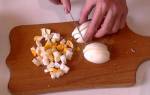 - Сделать соус из майонеза, винного уксуса и чеснока. Лук нарезать мелкими кубиками и замариновать в соусе.