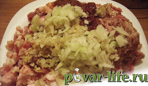 Печень, свиную вырезку и шпик покрошите на небольшие кусочки. Добавьте фарш, мелко покрошенную луковицу и чеснок.