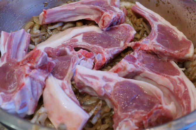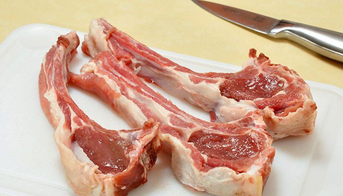 - Перед маринованием корейку нужно разрубить на порционные куски так, чтобы в каждом оказалось по 1 кости. Также баранину требуется хорошо промыть, срезать лишний жир, обсушить куски бумажными салфетками.