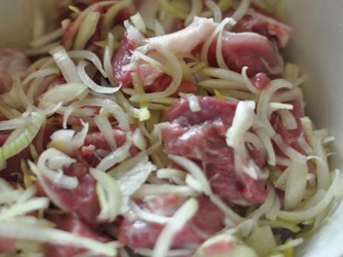 - Лук нарезаем тонко, добавляем к нему специи и перетираем рукой, чтобы выделился сок. Смешиваем лук с кусочками мяса. Разбавляем уксус водой, влив воды вдвое больше, чем уксуса. Даем мясу постоять не менее четырех часов, можно оставить мариноваться мясо на всю ночь.