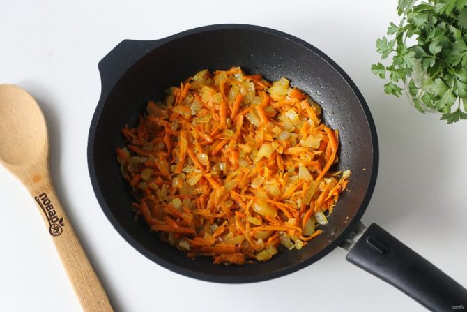 Оставшуюся морковь и лук обжарьте на сковороде до мягкости.