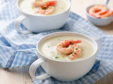 Польза кремового супа из креветок очевидна: морепродукты содержат легкоусвояемый белок, множество микроэлементов, в том числе и йод, который необходим для здоровья щитовидной железы. Так как креветки почти не содержат жира, то данное блюдо можно по праву назвать диетическим.