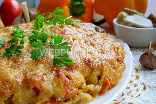 - Поставить запекаться в духовку на 50 мин., при 180°. После посыпать сыром, запечь ещё 5 мин., до корочки.