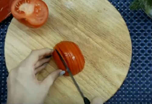 Поделите помидоры на половинки, нарежьте полукружьями.