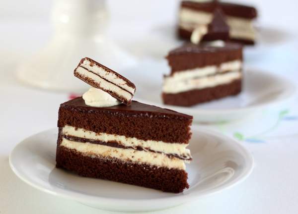 Сверху одной части бисквита выкладываем начинку и накрываем сверху вторым бисквитом. Заворачиваем десерт в пищевую плёнку и отправляем в холодильник на 1 час. Торт получается увеличенной копией известного десерта и на вид и по вкусу. Приятного аппетита!