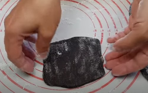 Припудрите столешницу и руки. Выложите ком. Сформируйте длинную (сантиметров 50), колбаску.
