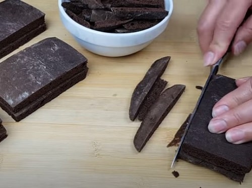 - Собирают торт, смазывая шоколадные коржи приготовленным кремом. Сверху сдобу можно полить глазурью, посыпать крошкой или просто обработать кремом.