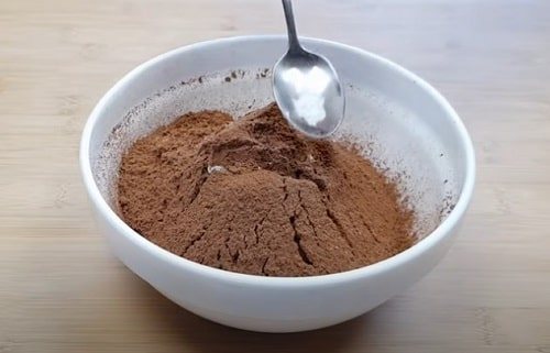 - Муку перед использованием просеивают. В отдельной посуде в муку всыпают какао-порошок и разрыхлитель. Размешивают до однородности.